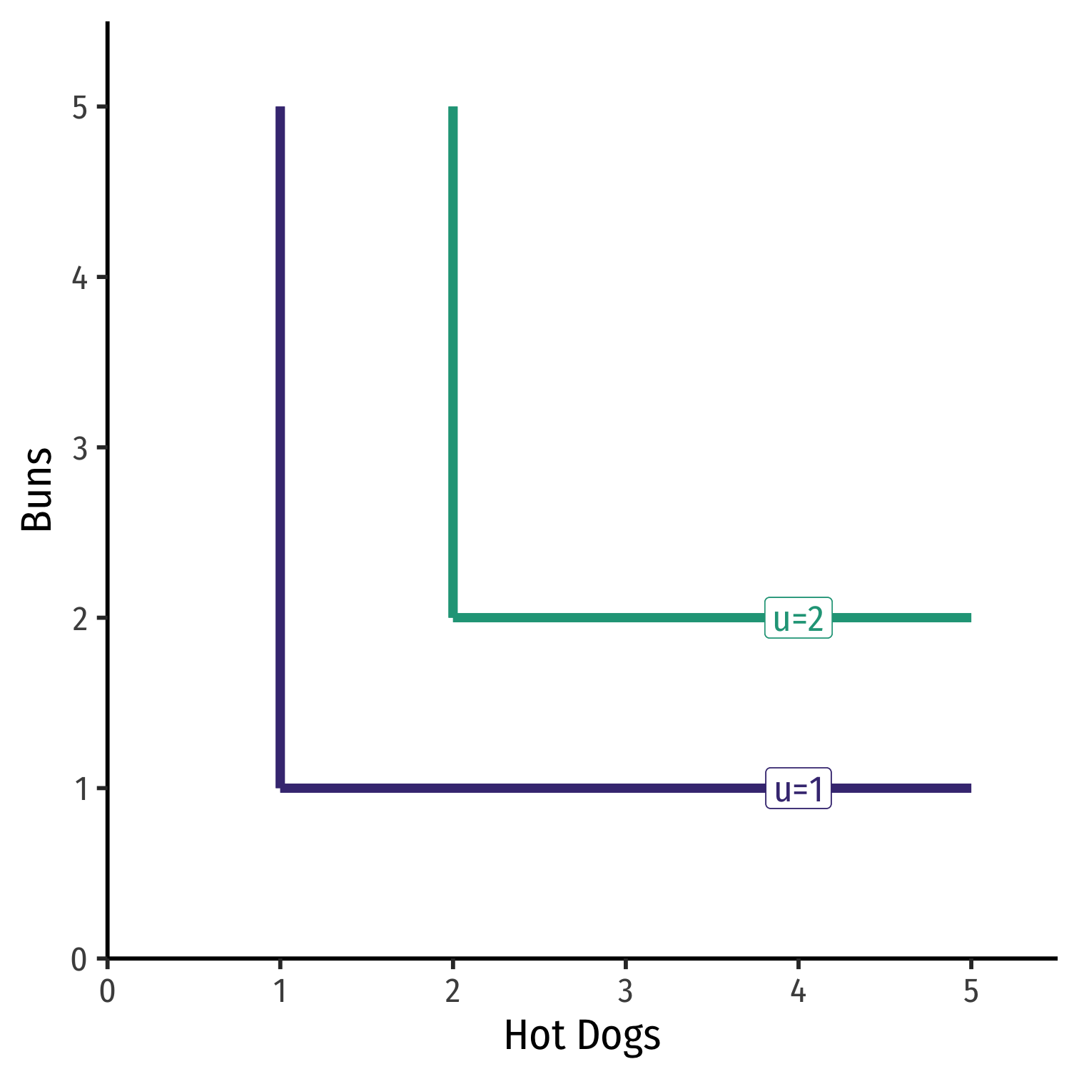 Indifference curve: all equally preferred bundles ⟺ same utility level