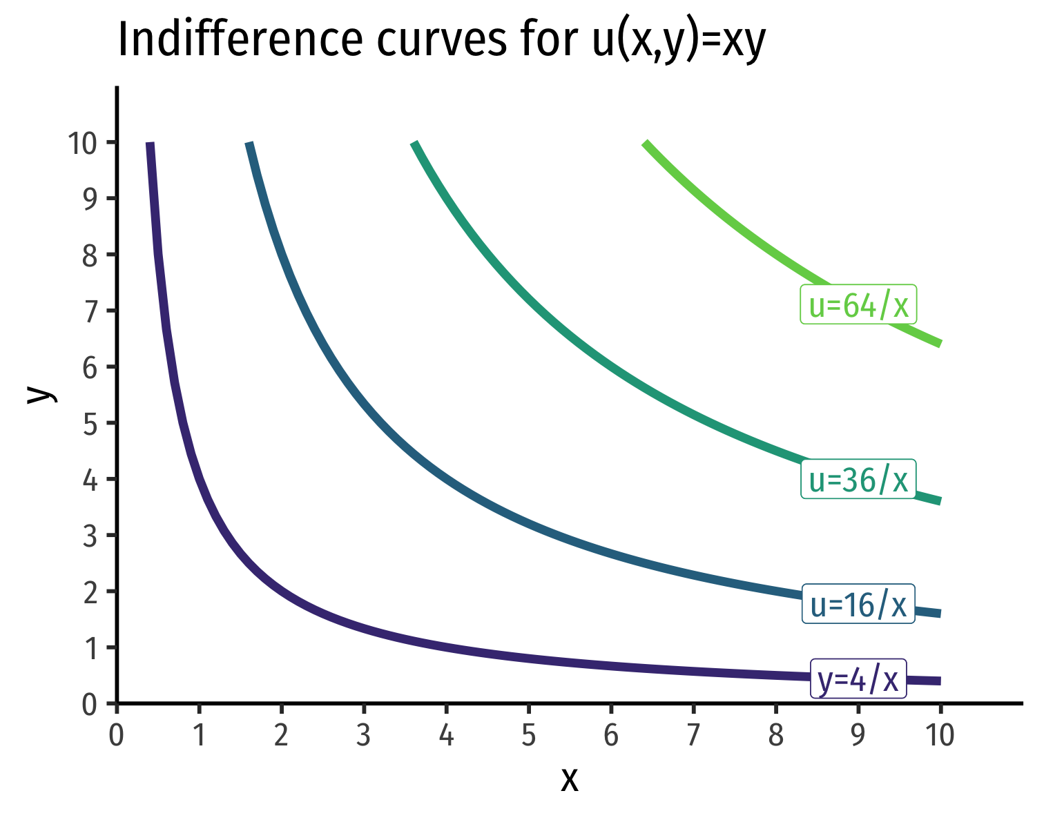 Indifference curve: all equally preferred bundles ⟺⟺ same utility level